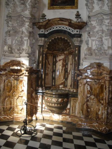 Es la pila bautismal del monasterio de la catuja de granada. Tiene los colores dorados y el las lozetas tienen el mismo dibujo que la foto anterior, y el agua se supone que esta en la pila.