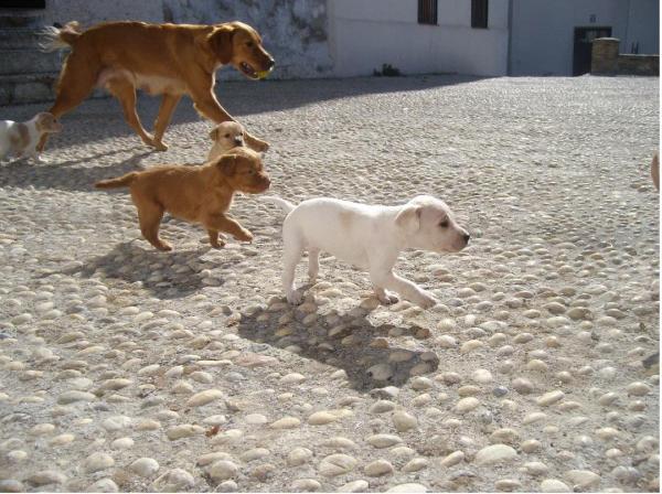 Como la fotografÃa me ha recordado a una portada de los Beatles (paso de cebra), en mi fotografÃa mi perra y sus cachorros (menos uno) siguen esa lÃnea de coordinación en el movimiento junto con las sombras.