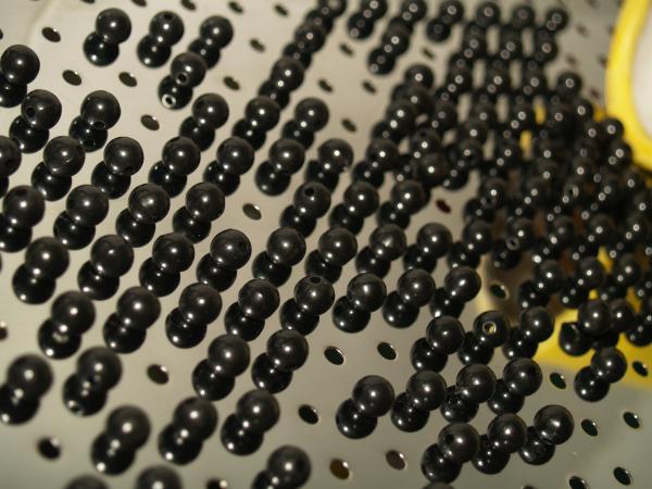 sigo con el orden y la repeticion. las bolitas negras se ordenan segun la superficie que las atrae hacia los agujeros. cuido ahora el enfoque en el que aparece en un plano intermedio, nada en primer plano y ultimo. el punto de vista es el mismo, oblicuo. ademas cambio en esta foto los huecos y las sombras por el relieve y los reflejos.